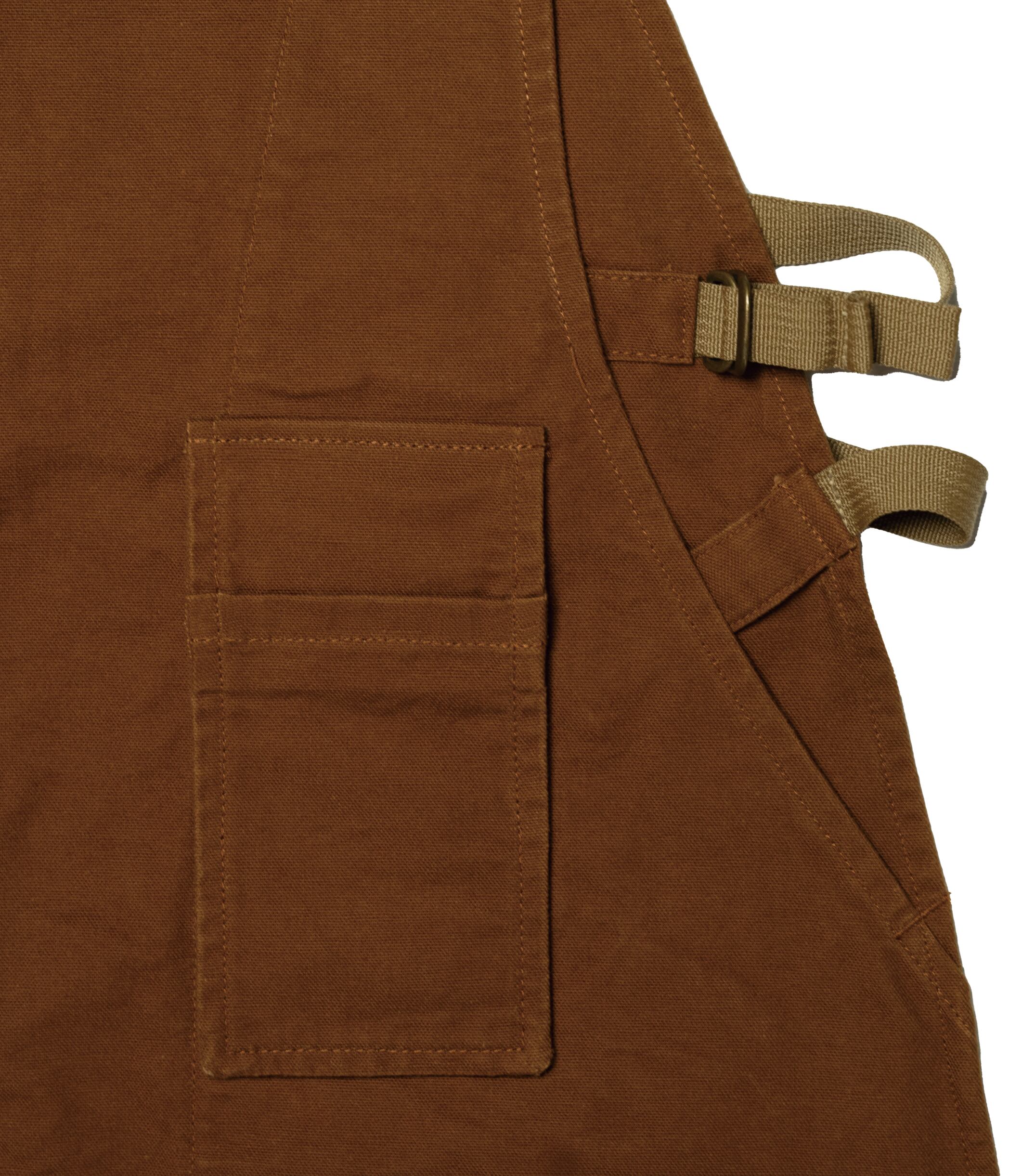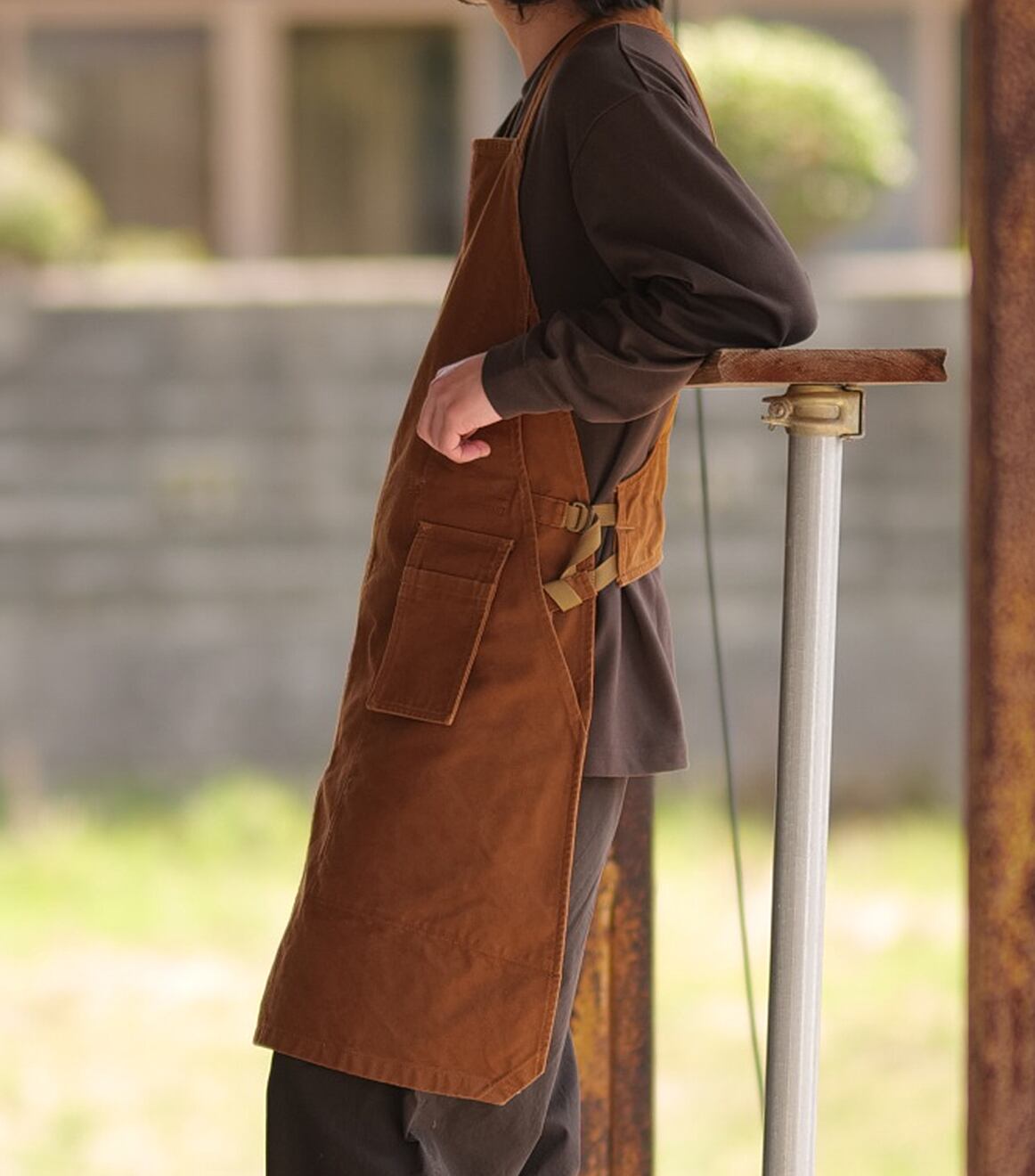 ワークブランド「Carhartt」に代表されるダック生地をイメージ。ヴィンテージでみられる生地とは異なり、芯までしっかりと染色された、厚手で高密度なコットンキャンバスです。身体をしっかりと支えてくれるタフなダック地は、はじめのパリっとした生地感から着込むほどに柔らかく馴染み、味わい深いエイジングが楽しめる--まさに「育てる素材」です。[cotton100%]