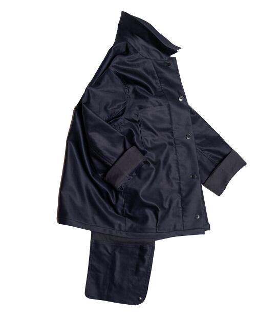 MOLESKINを用いたCHORE JACKET。肩回りの重さを感じさせない着用感と広い可動域が特徴で、実際に着用することでその機能性を体感できるデザインになっています。袖は作業の妨げにならないように七分袖に変形できる設計が施され、胸ポケットや前立ての仕様と相まってどことなく和装を彷彿とさせるデザインとなっているのもユニークです。前後のボディ部分には裏地が備えられており、その全体が大容量の収納スペースとして機能します。両サイドに配置されたファスナーポケットから収納スペースにアクセス可能です。さらに右サイドにはフラシポケットがあり、普段は内側に収納可能な構造になっています。
