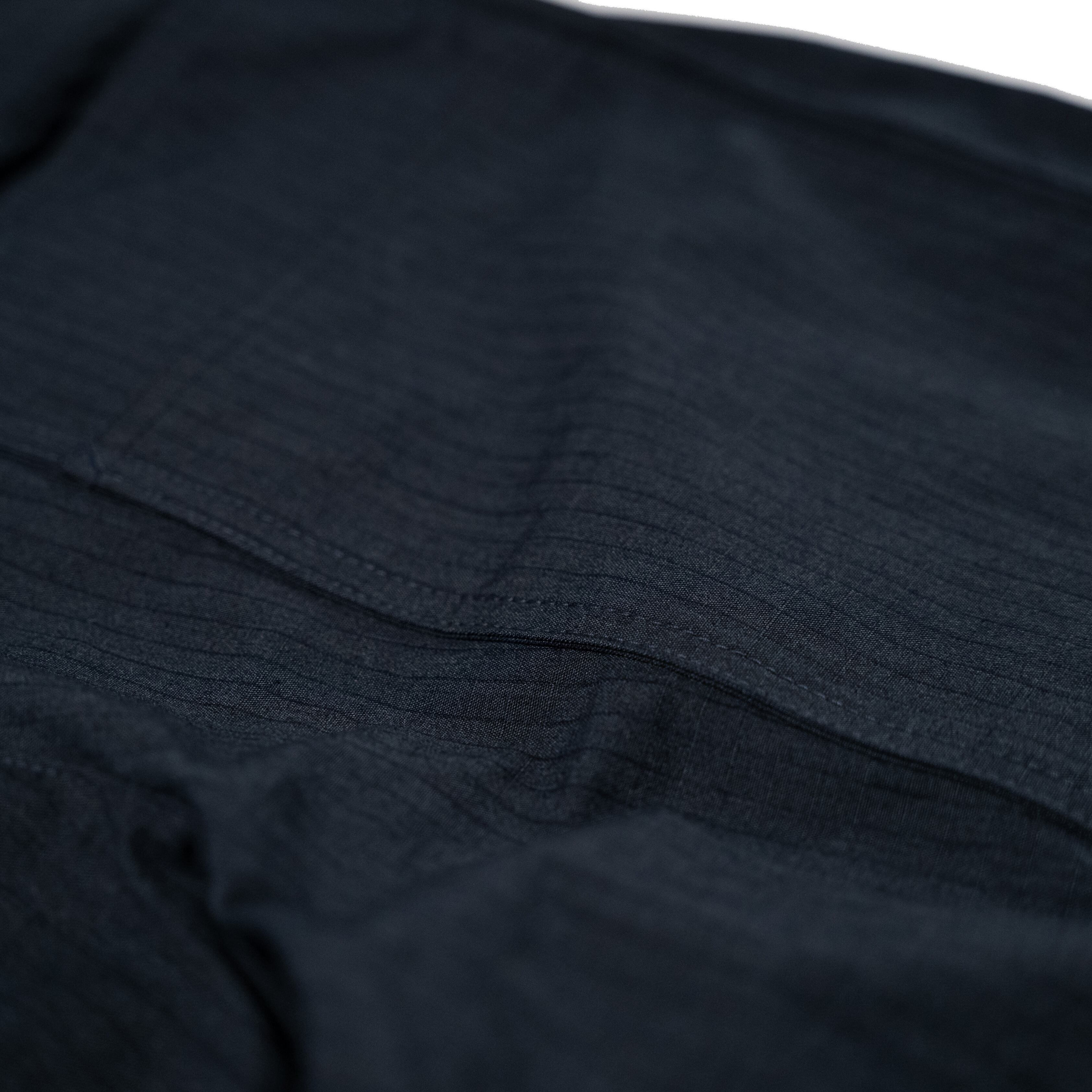 cotton53% nylon47%RIPSTOP。軽量ながらハリのあるタフな質感は形をしっかり保ち存在感のあるシルエットをつくり出します。マットでナチュラルな素材感、リップストプの構造とナイロンの特性による機能性をバランス良く兼ね備えた生地です。